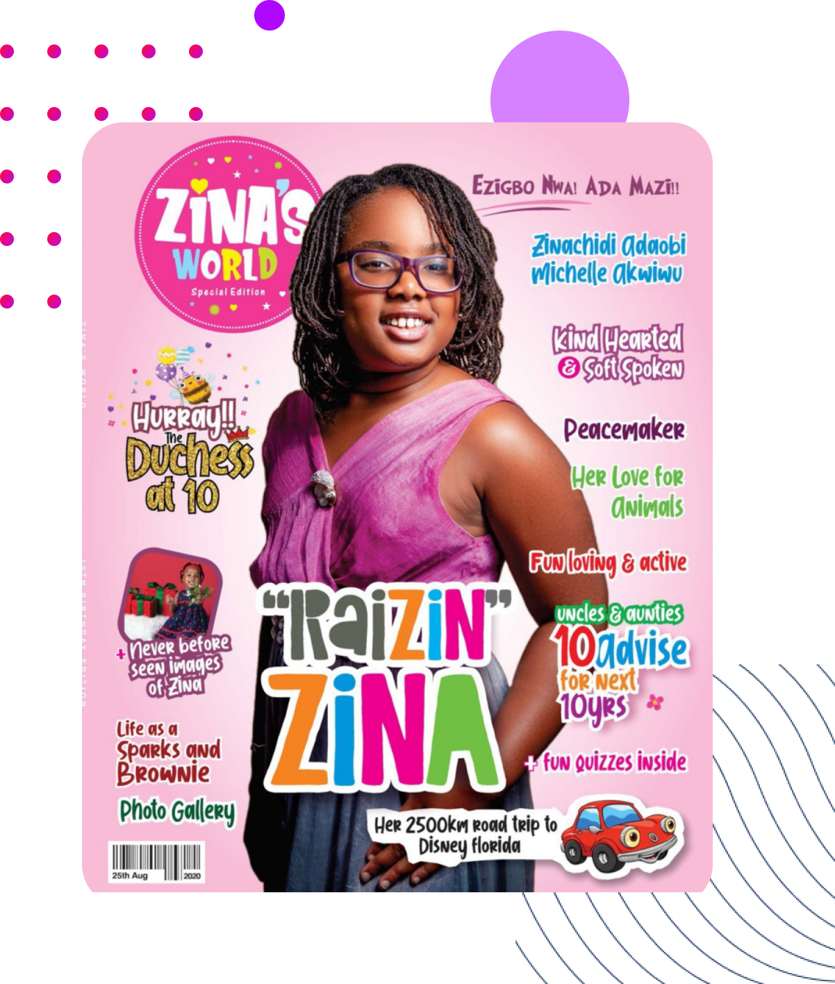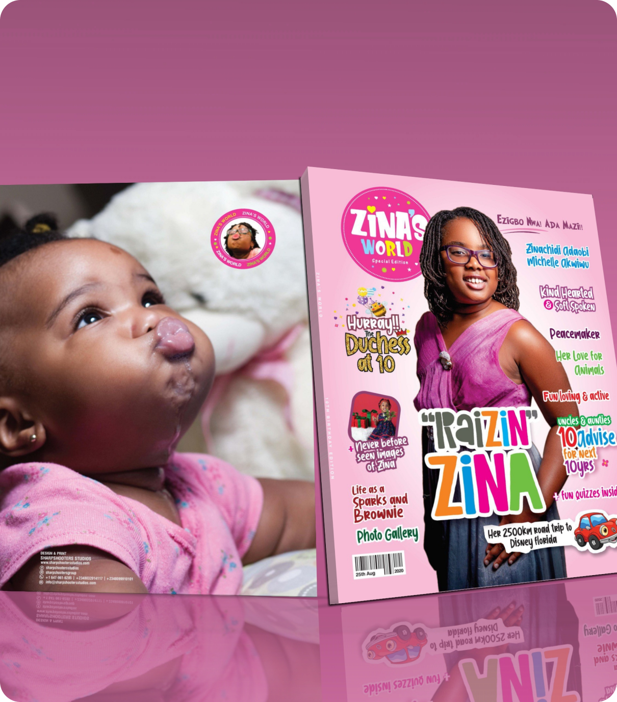 The magazine is being used as fundraising to donate money to SickKids Foundation; To set up a library at the nursery and primary school at Zina's home town in Imo State Nigeria and to adopt a dog from shelter to give it a home where it can be cared for.